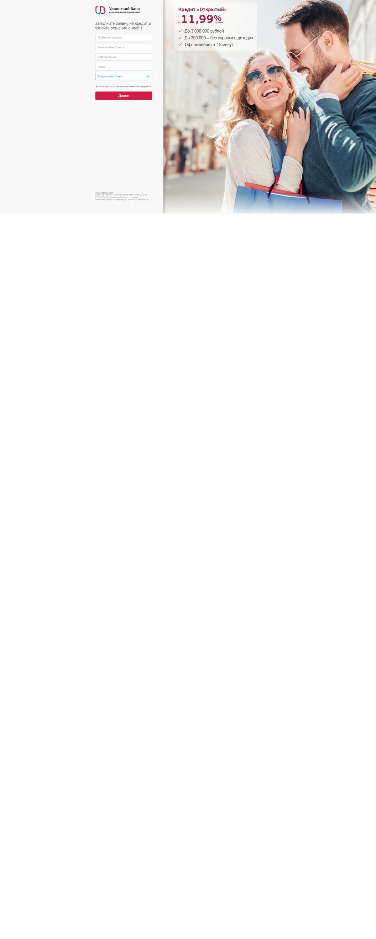 УБРиР - Уральский банк реконструкции и развития Заполнить заявку можно на сайте и узнать решение онлайн, без посещения офиса Быстрое оформление кредита в офисе – от 15 минут Снижение ставки по кредиту за вовремя внесенные платежи Для действующих клиентов – особые условия Сумма займа: от 50 000 до 600 000 рублей Срок займа: от 36 до 84 месяца Ставка (годовая): снижаем до 11% Предварительное решение по телефону: от 7 минут после оформления онлайн-заявки Время оформления в отделении банка: от 15 минут до 2-х дней в случае одобрения онлайн-заявки Досрочное погашение: без комиссий Требование к заёмщику: Возраст от 21 до 75 лет Постоянное место работы: стаж на последнем месте работы - от 3 месяцев, общий трудовой стаж - от 12 месяцев Постоянное место регистрации в одном из регионов присутствия банка Ежемесячный доход: при сумме кредита от 50 000 до 200 000 руб.