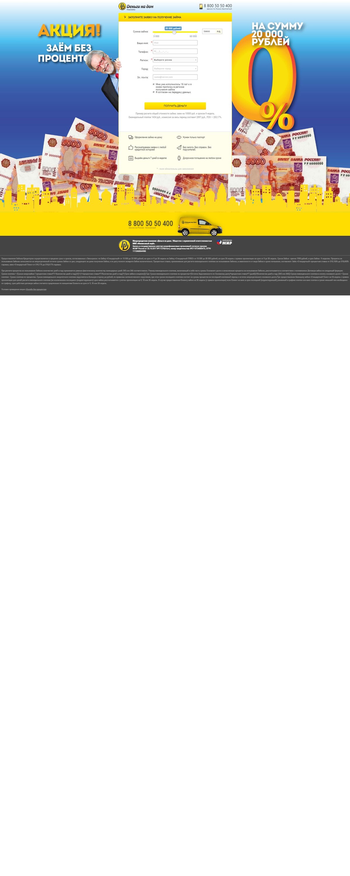 Сумма займа: от 3 000 до 60 000 рублей (Займы свыше 41 000 рублей доступны при повторном обращении) Срок займа: до 26 недель Требование к заёмщику: Возраст: от 18 лет Прописка в регионе получения займа Гражданство РФ Способы получения: Наличными на дом По продукту До зарплаты(повторный заем) возможно получение в офисе.