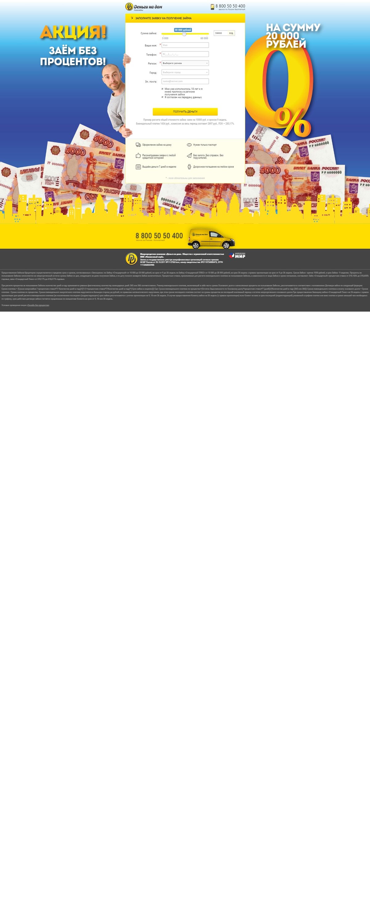 Сумма займа: от 3 000 до 60 000 рублей (Займы свыше 41 000 рублей доступны при повторном обращении) Срок займа: до 26 недель Требование к заёмщику: Возраст: от 18 лет Прописка в регионе получения займа Гражданство РФ Способы получения: Наличными на дом По продукту До зарплаты(повторный заем) возможно получение в офисе.