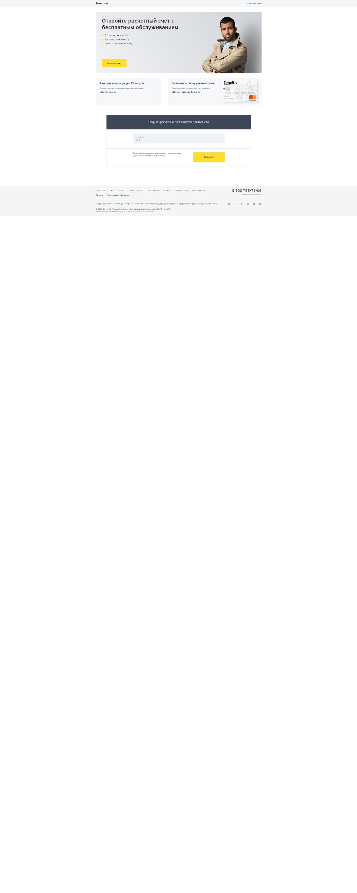 «Тинькофф Банк» — Лучший банк для бизнеса Первые два месяца — бесплатно Дальше — от 0 ₽ Целевое действие в оффере: Открытый счет 5000 рублей за открытый счет для вебмастера цена итоговая Плюсы работы для вебмастеров: Работа с надежным работодателем: Тинькофф Банк был признан лучшим розничным онлайн-банком России в 2018 и 2016 годах по версии Global Finance и Банком года в России в 2017 и 2013 по версии The Banker.