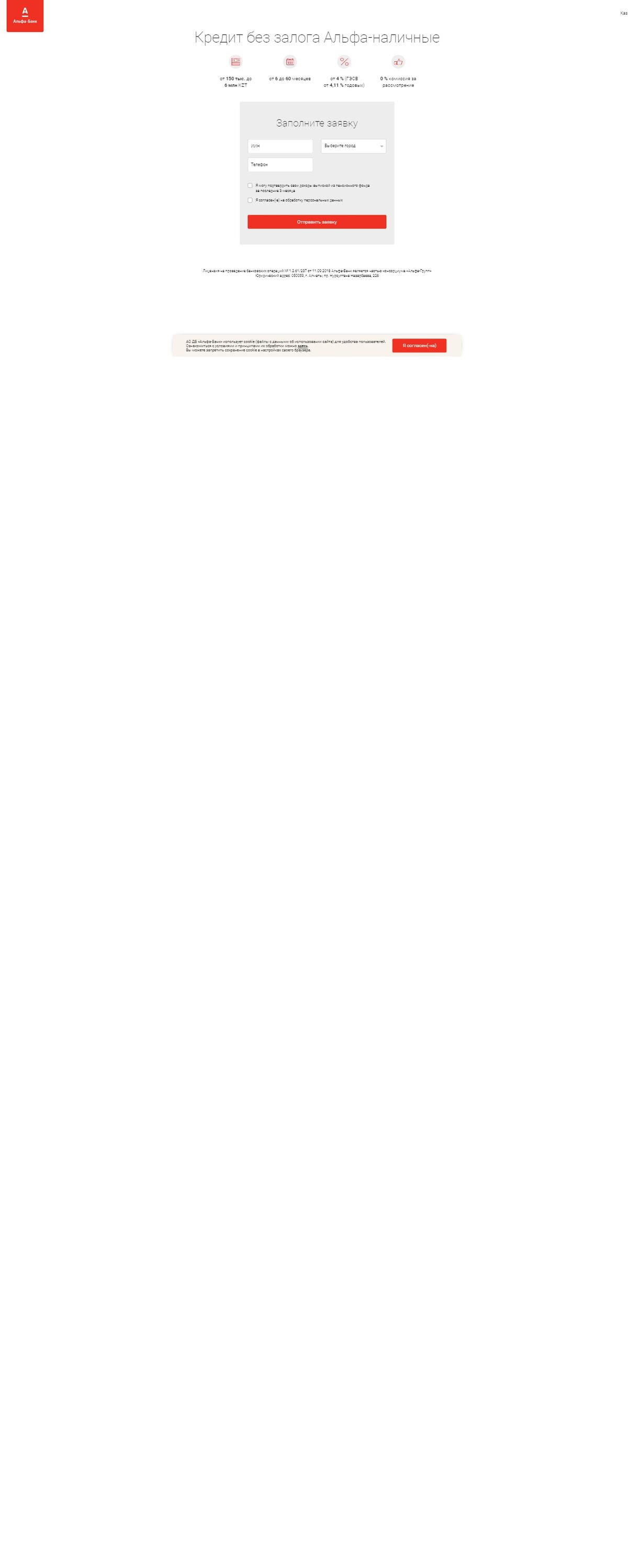 Действующая акция по продукту «Оформляйте кредиты с 26 марта по 31 июля на сумму от 800 000 до 1 100 000 и получайте гарантированный подарок от Альфа-Банка – телевизор!» Сумма кредита: от 150 000 до 6 000 000 тенге Срок кредита: от 60 до 60 мес.