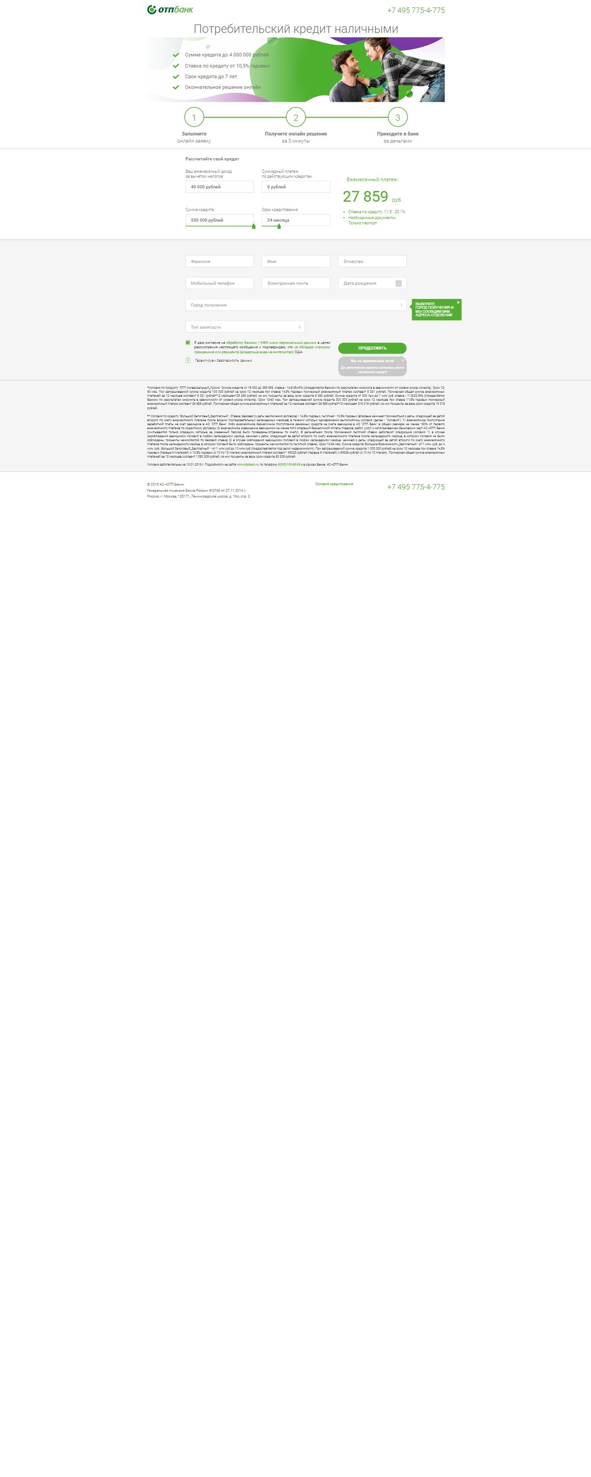 Сумма займа: от 100 000 до 1 000 000 рублей Срок займа: от 1 до 5 лет Ставка 11,5% при сумме кредита от 300 000 рублей Ставка от 14,9% при сумме кредита до 300 000 рублей Требование к заёмщику: Гражданство РФ Возраст от 21 до 65 лет Регистрация в регионе оформления кредита Тип занятости: - Работа по найму - Госслужащий - Военный - Пенсионер Стаж работы на последнем месте Больше 4х месяцев Скоринговый балл Эквифакс от 600 Наличие кредитной истории: - Погасил, просрочек не было - Есть кредит, погашает исправно - Погасил, были просрочки Текущая долговая нагрузка Максимальные текущий pti 50% Способы погашения: C карты любого банка С помощью сервиса "Золотая корона - погашение кредитов" В салонах связи: "Связной", "Мегафон" Через терминалы и кошелек "Visa Qiwi Wallnet", "Элекснет", "Рапида", "КИБЕРПЛАТ" Со счета мобильного телефона Через систему "Comepay" Через платежные системы "Яндекс.Деньги" В терминалах самообслуживания ОТП В центрах продаж и обслуживания «Ростелеком» Почтовым перевод "Юнистрим", "Почта Росии" Банковским переводом Способы получения: В отделении банка