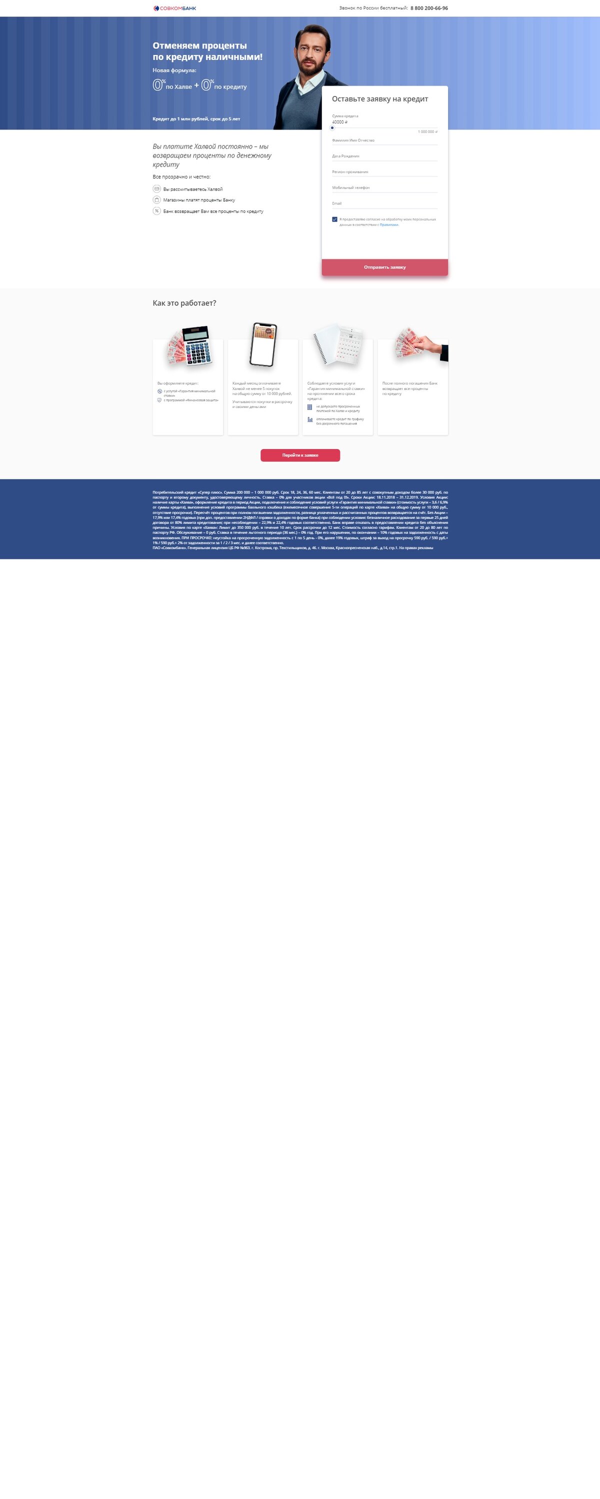 Ставка – 0% для участников акции «Всё под 0!» Доступны специальные условия для заемщиков: Отменяем проценты по кредиту наличными! Новая формула: 0% по Халве + 0% по кредиту Кредит до 1 млн рублей, срок до 5 лет Платите Халвой постоянно - возвращаем проценты по денежному кредиту Все прозрачно и честно: Рассчитываетесь Халвой Магазины платят проценты Банку Банк возвращает все проценты по кредиту Способы погашения: Онлайн платеж Карта Совкомбанка Интернет банк Отделения банка Банкоматы и устройства самообслуживания Требование к заёмщику: Гражданство РФ Возраст от 35 до 85 лет Стаж не менее 4 месяцев на последнем месте работы Постоянная регистрация не менее 4-х последних месяцев (на территории одного населенного пункта РФ) и проживание в городе присутствия подразделения Банка или прилегающих населенных пунктах (но не более 70 километров от границы населенного пункта) Наличие стационарного рабочего или домашнего телефона