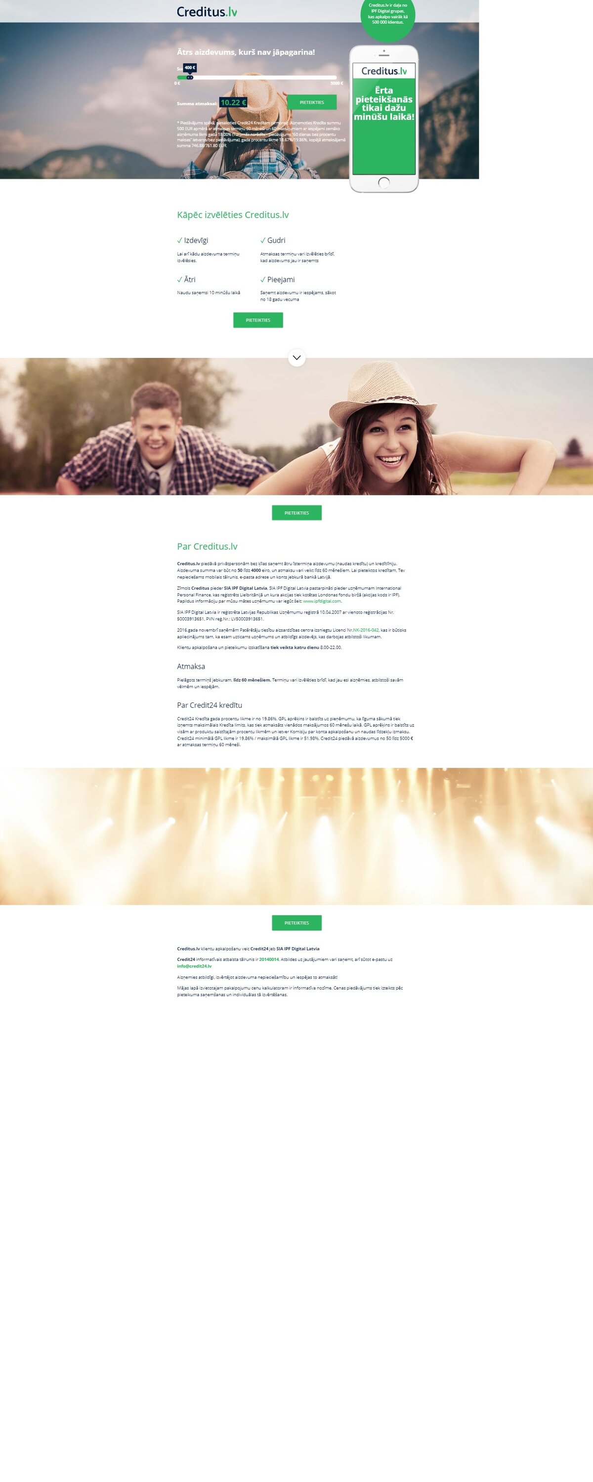 Creditus LV is a loan that grants up to 5 € to 425 € for up to 3 month Type of the advertisement campaign: CPS Description of the accepted action: unique loan application submitted on > Creditus LV Description of the reasons, for which the action may be declined: client is younger than 21 years old