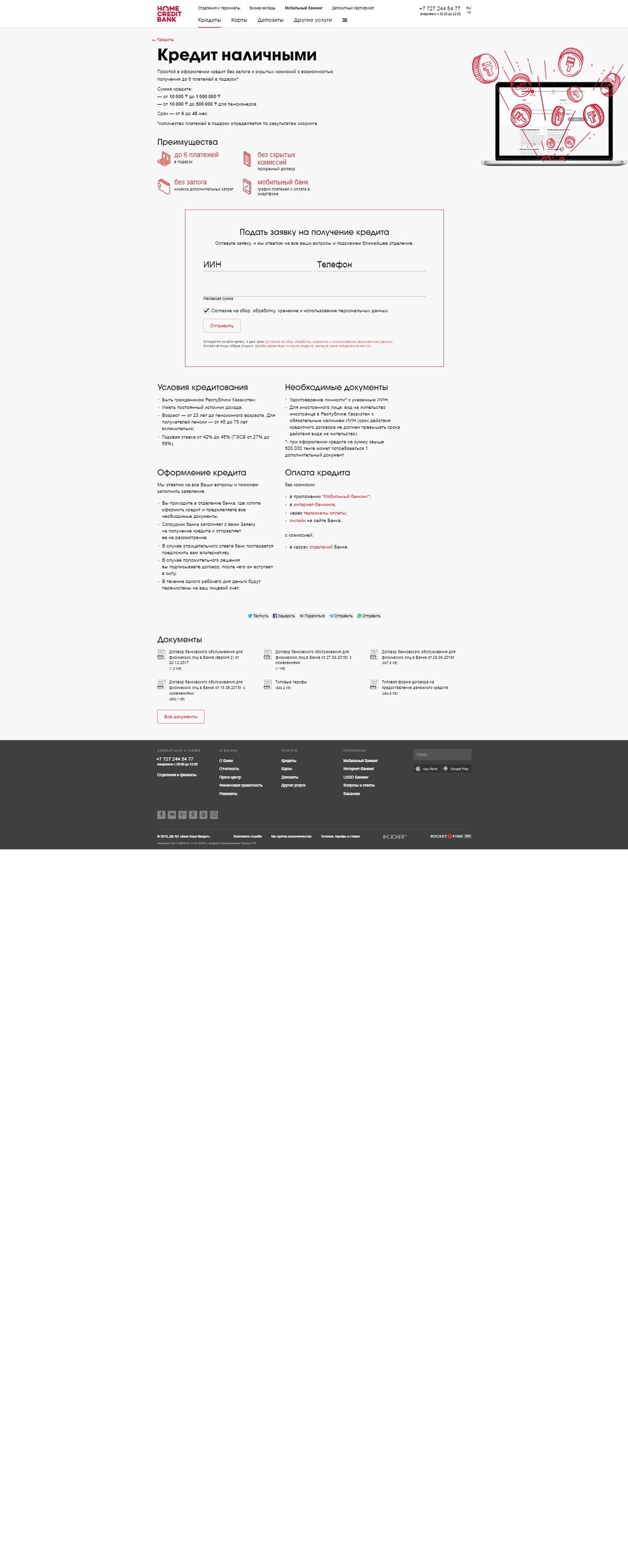 Для получения кредита вам будет необходимо подойти в банковский офис Новая лицензия Для получения займа необходимо Гражданство: Республика Казахстан Возраст: 23+; Для получателей пенсии — от 45 до 75 лет включительно Иметь постоянный источник дохода Способы получения: Оформить заявку онлайн, получить деньги наличными в отделении банка Способы погашения: В интернет-банке В мобильном банке «Моби» В терминалах оплаты В филиалах и отделениях АО ДБ «HomeCredit Bank» В кассах «Казпочта» PostClick cookie: Сколько дней – 30 дней Средний холд: Сколько дней – 30 дней