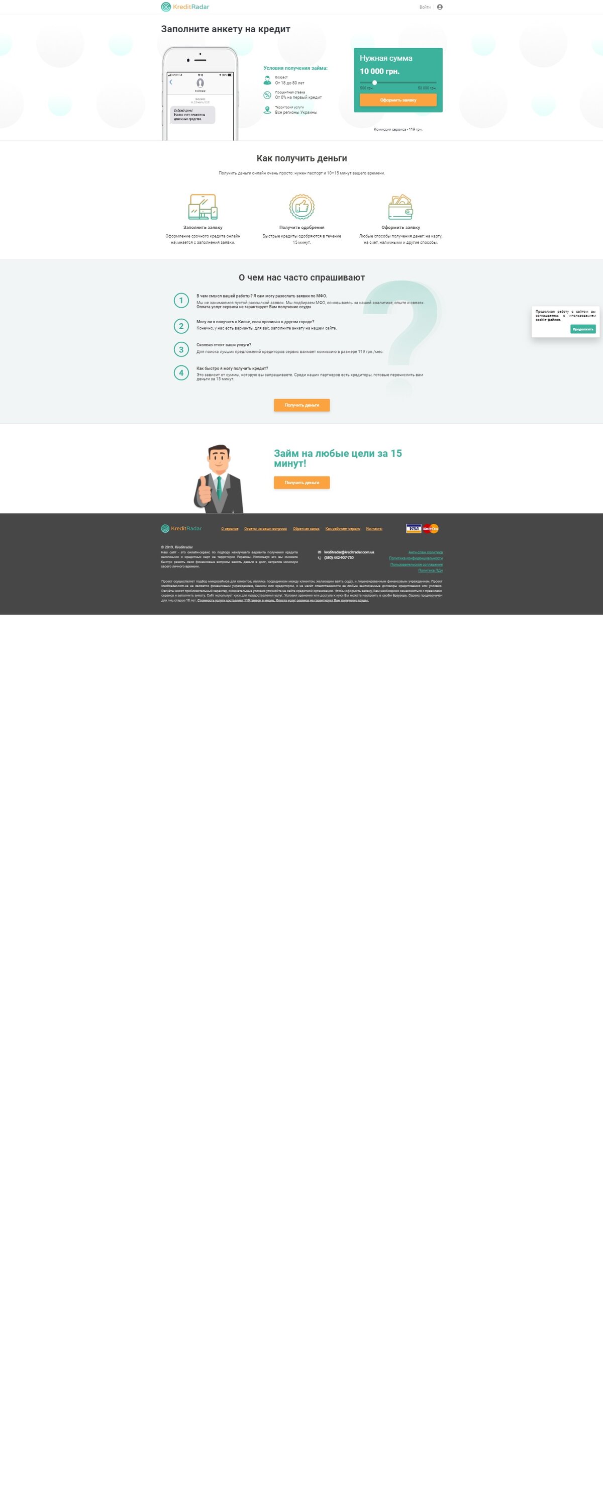 Преимущества для клиентов: мгновенные кредиты онлайн по всей Украине; выдача денег производится в течение 15 минут; размер кредита от 500 - 50 000 грн.