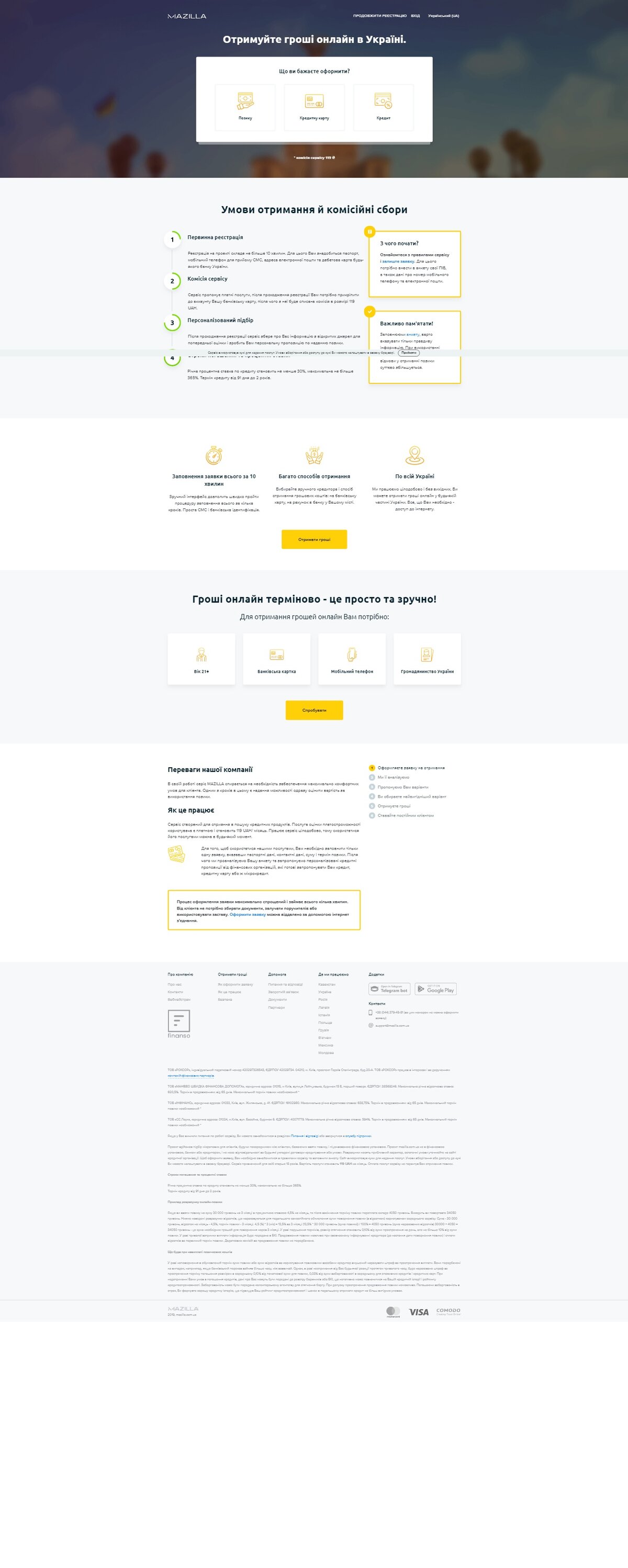 Mazilla UA – При помощи нашего сервиса, каждый желающий может получить кредит прямо на свою банковскую карту и всего за 15 минут Счета по офферу создаются раз в месяц, а именно после 15 числа следующего месяца Мотивационная сетка: до 500 заявок - 50 UAH от 501 до 750 заявок - 55 UAH от 751 до 1000 заявок - 60 UAH более 1000 заявок- 65 UAH Теперь можно лить на три проекта (Credilo UA/ Mazilla UA/ Visame UA) - количество заявок суммируется! Сумма займа: от 1000 до 15 000 грн.