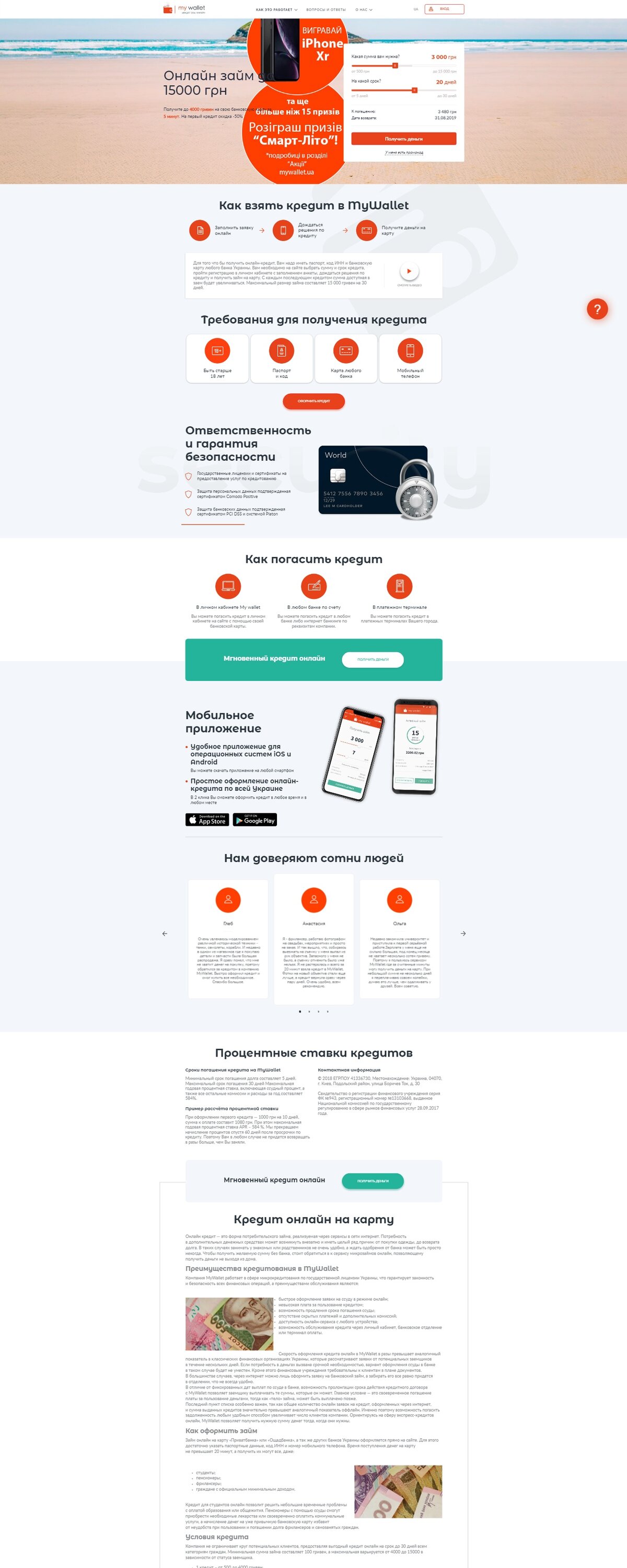 Подробности тут! Преимущества MyWallet: - c 01.08.2019 ставка на первый кредит - 0,8% (-50% на первый кредит) - повторный кредит - 1,6% - работа 24/7 офера - поддержка (колл центр) с 9:00 до 20:00 - выдача кредитов 24/7 - выдача кредита за 5 минут автоматичеки, в случае если нужна доп проверка клиента до 20 минут.