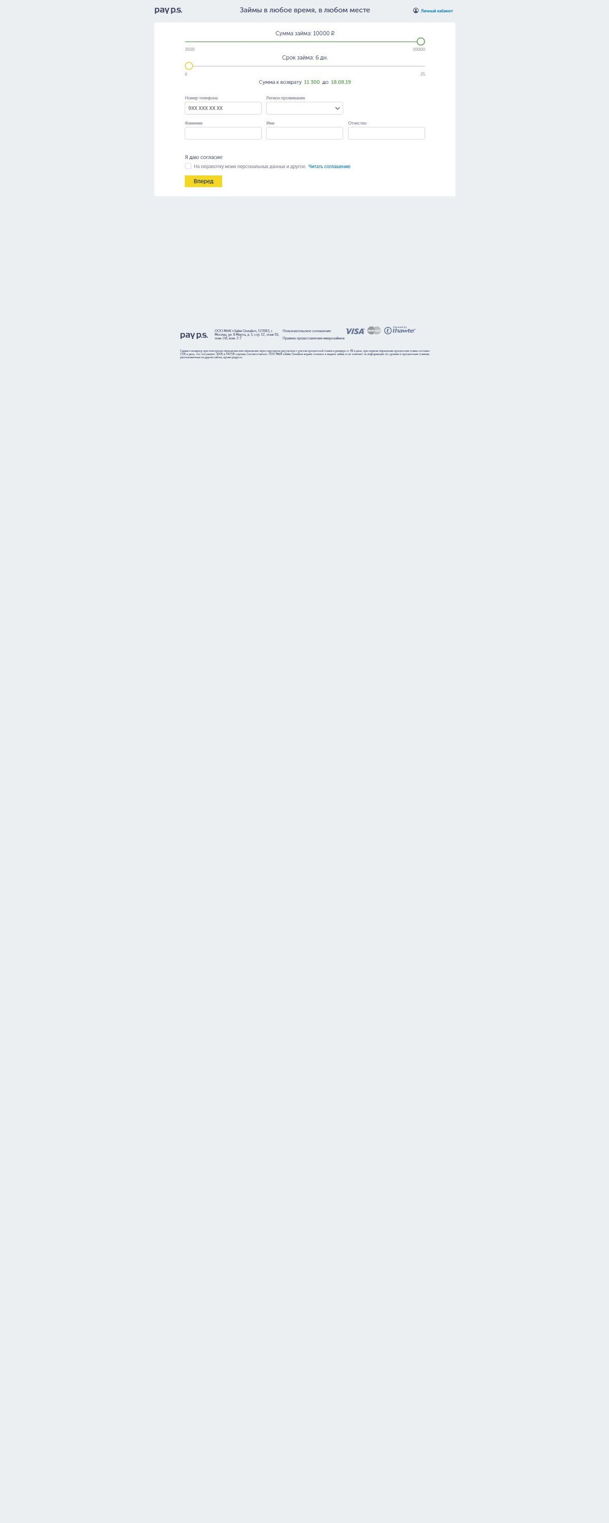 Сумма займа: от 1 000 до 30 000 рублей Срок займа: от 1 до 30 дней Процентная ставка: от 0,8% в день Требование к заёмщику: от 21 до 63 лет Гражданство РФ Место постоянной регистрации и проживания на территории РФ Способы получения: перевод на любую банковскую карточку, выпущенную любым банком в России перевод на ваш личный банковский счёт в любом банке России денежный перевод через систему CONTACT Способы погашения: С помощью системы "CONTACT" В офисах "МТС" Банковским переводом И другими доступными способами