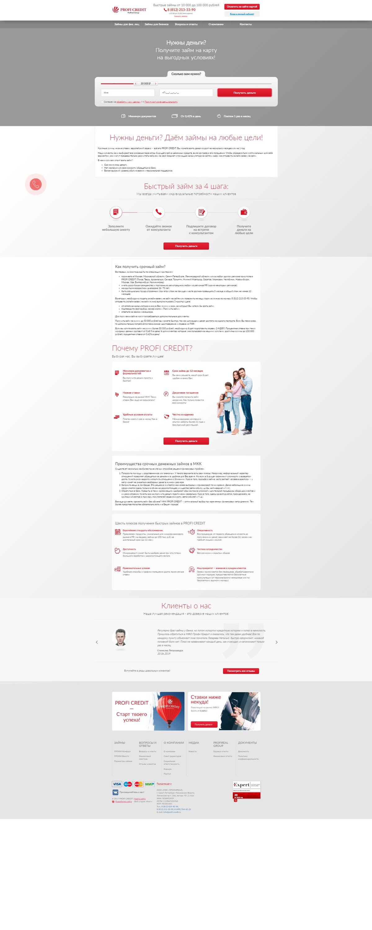 Семенов / Калининград + Калининградская область в пределах КАД / Краснодар / Нижний Тагил / Ульяновск + область / Челябинск (для продукта ПРОФИ Комфорт жителям СПб достаточно иметь прописку в РФ) Трудоустройство: официальное трудоустройство или пенсия (по выслуге лет, по здоровью и т.п.) Стаж работы на текущем месте — не менее 3 месяцев Общий трудовой стаж – не менее 12 месяцев Отменено официальное трудоустр для 4-х городов: СПб, Псков, Петрозаводск, Великий Новгород Способы получения: Банковская карта/счет Способы погашения: Через платежные терминалы "Элекснет" Банковским переводом на расчетный счет ООО "МКК "ПРОФИРЕАЛ"