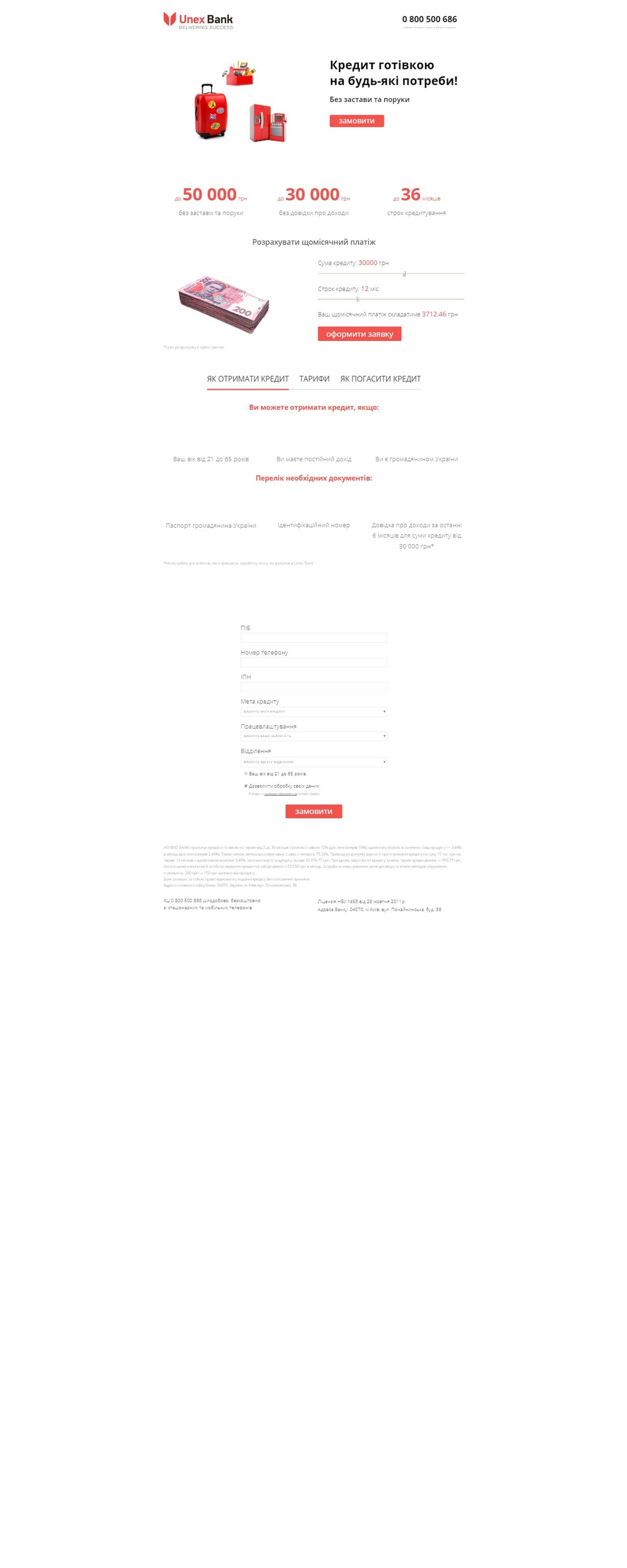 Процентная ставка: от 2.7% в год Комиссия за обслуживание кредита: от 2.49% ежемесячно Требование к заёмщику: Гражданство Украины Возраст: от 21 до 65 лет на момент окончания срока действия кредитного договора; Зарегистрированное место жительства на территории Украины Имеет постоянный доход и постоянное трудоустройство Трудоустройство: официально, по договору о предоставлении услуг / выполнения работ, физическое лицо предприниматель или пенсионер.