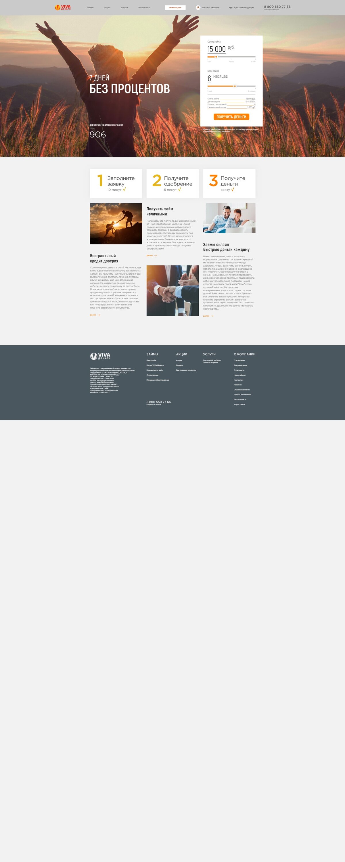 Требование к заёмщику: Гражданин России (требуется только паспорт) Постоянная регистрация в одном из городов присутствия Компании VIVA Деньги Возраст от 21 года Нет задолженности перед компанией VIVA Деньги Способы получения: В офисе компании Банковская карта Карта VIVA Деньги Способы погашения: Банковскими картами "VISA" и "MasterCard" Наличными в Офисе компании Золотая Корона Мегафон Терминалы Форвард Мобайл Сбербанк Билайн Магазины KARI Наличными в салонах связи "Связной", "Евросеть", "МТС", "Билайн" Московский Кредитный Банк