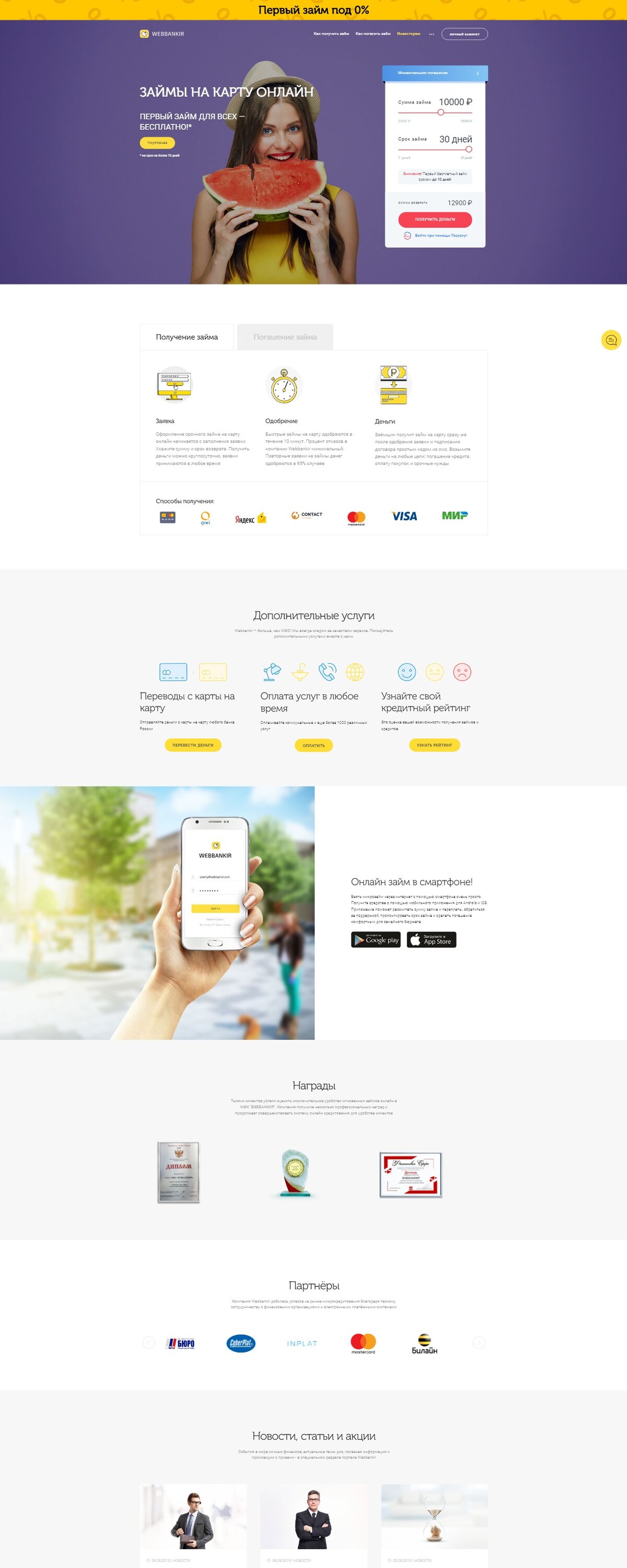 Webbankir - система моментального электронного кредитования - предоставляет онлайн микрозаймы «под ключ», начиная с рассмотрения заявки до получения клиентом денежных средств за 10 минут Сумма займа: 1 000 до 15 000 рублей До 30 000 рублей для повторного займа Срок займа: от 5 до 30 дней Ставка до 1% Акция для клиентов — первый займ на 10 дней бесплатно Требование к заёмщику: Возраст: от 24 лет гражданин РФ Способы получения/погашения: банковская карта Яндекс.Деньги Сбербанк Онлайн мобильный телефон QIWI Золотая Корона Терминалы Элекснет Терминалы МКБ Банковский перевод Почтовый перевод